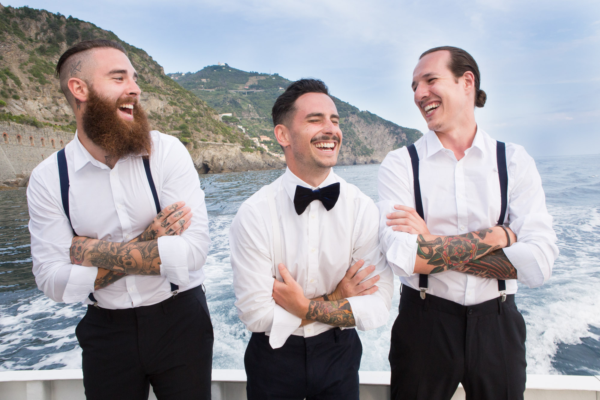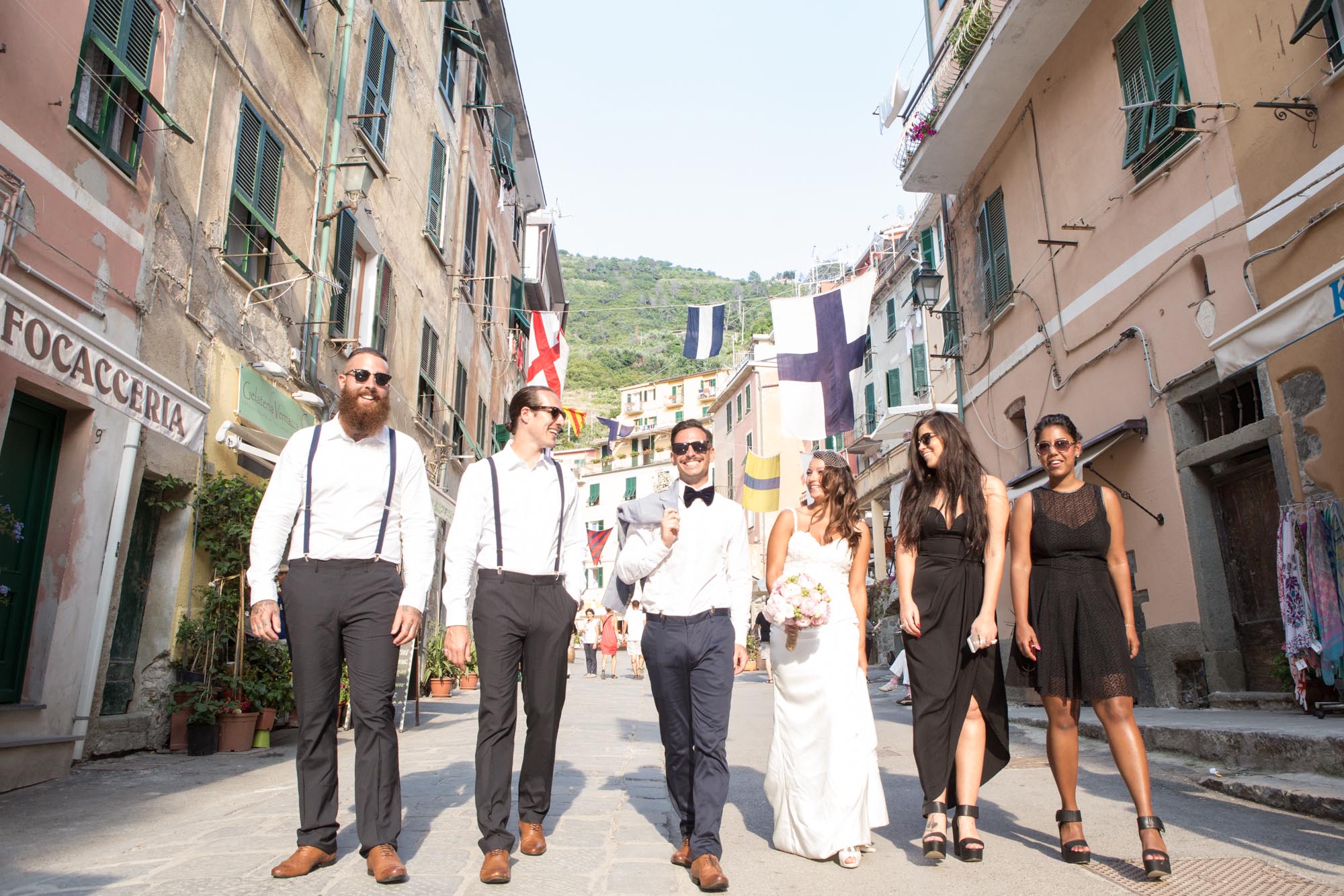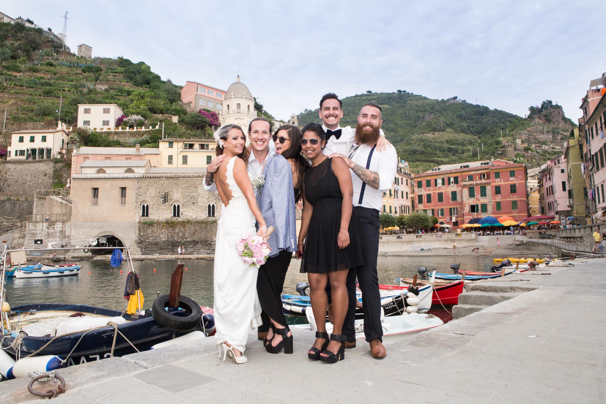 Sabrina and Jarrad and their friends were travelling together and had travelled together before and so there was a beautiful strong bond between them. Wherever they went during the pre/post wedding activities and the wedding they had a ball. And because it was just their best friends they were able to treat everyone to the best of the Cinque Terre, with their ceremony on a cliff top terrace overlooking the Mediterranean Sea, the reception on a private terrace in one of the best restaurants and a private boat trip with top Cinque Terre wine and music from local artists who have performed with Sting and Robbie Williams!