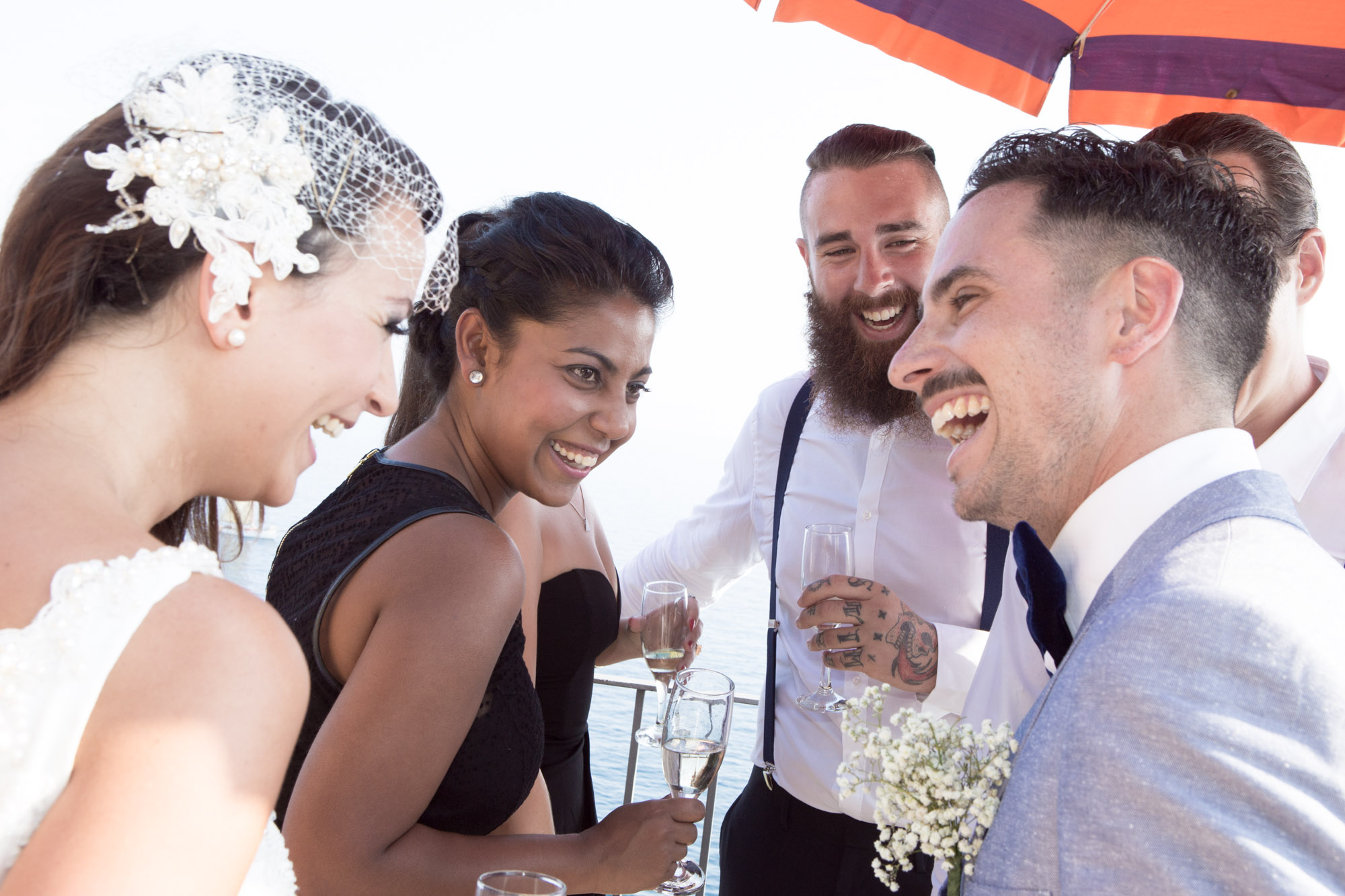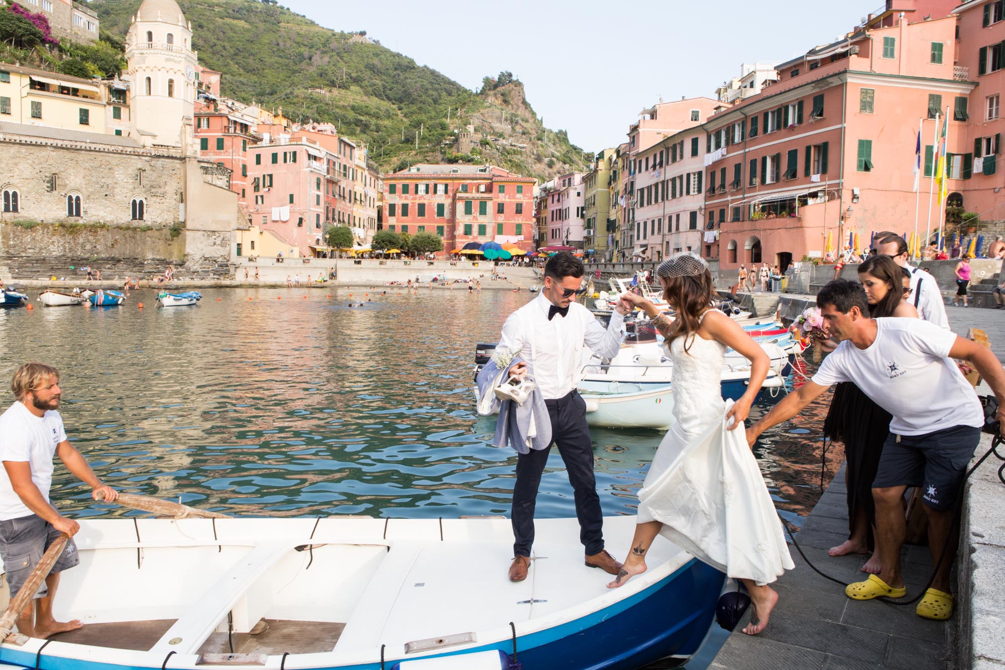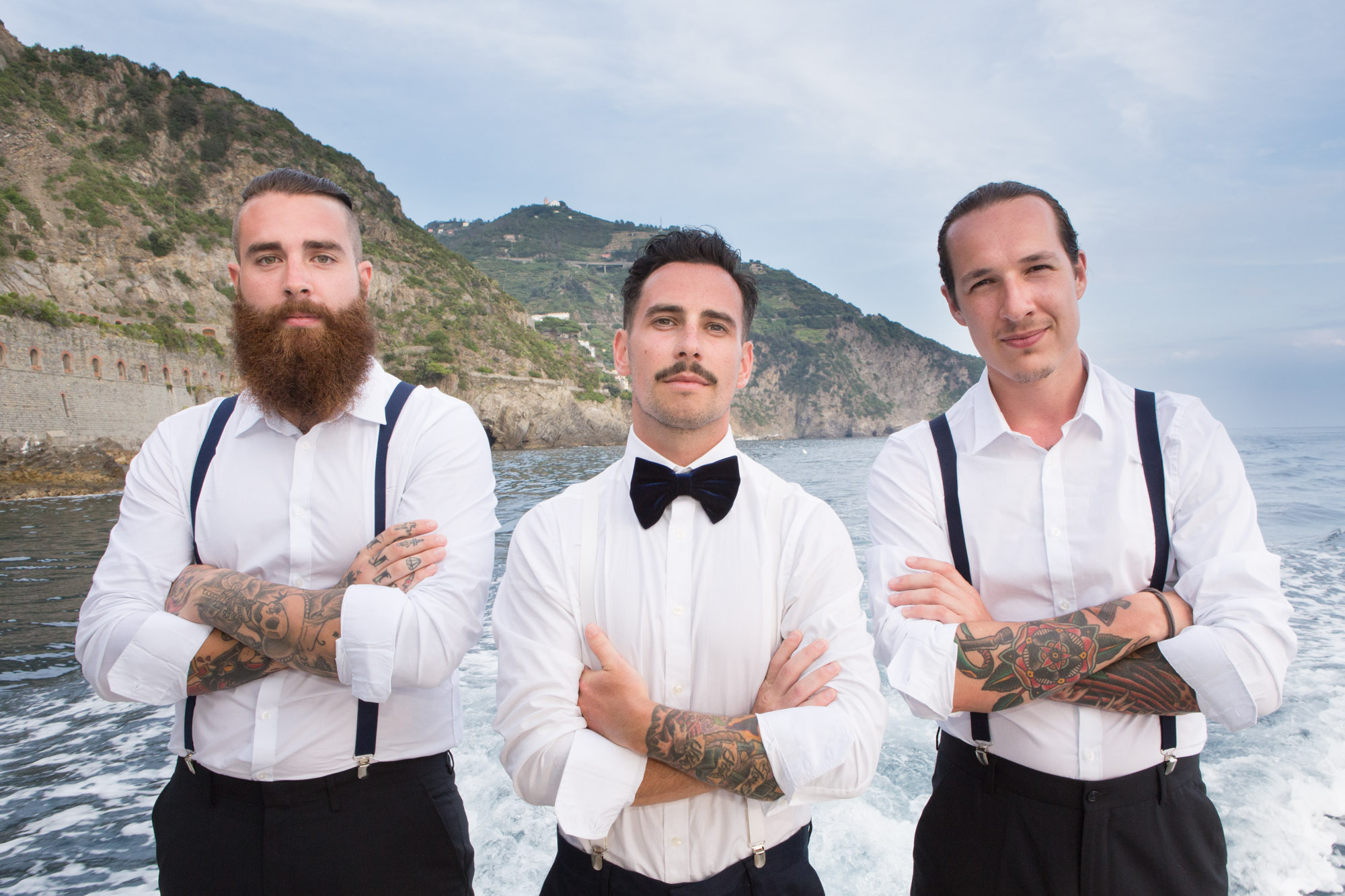 Sabrina and Jarrad and their friends were travelling together and had travelled together before and so there was a beautiful strong bond between them. Wherever they went during the pre/post wedding activities and the wedding they had a ball. And because it was just their best friends they were able to treat everyone to the best of the Cinque Terre, with their ceremony on a cliff top terrace overlooking the Mediterranean Sea, the reception on a private terrace in one of the best restaurants and a private boat trip with top Cinque Terre wine and music from local artists who have performed with Sting and Robbie Williams!